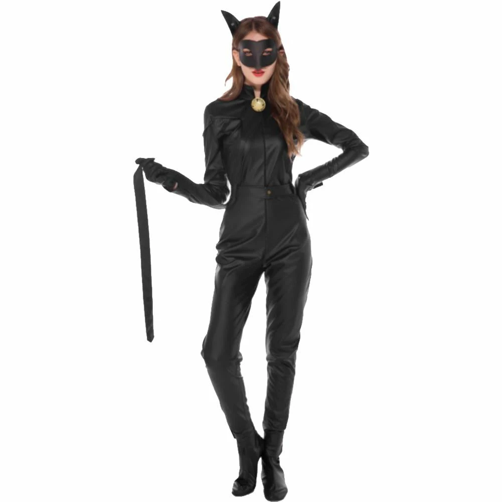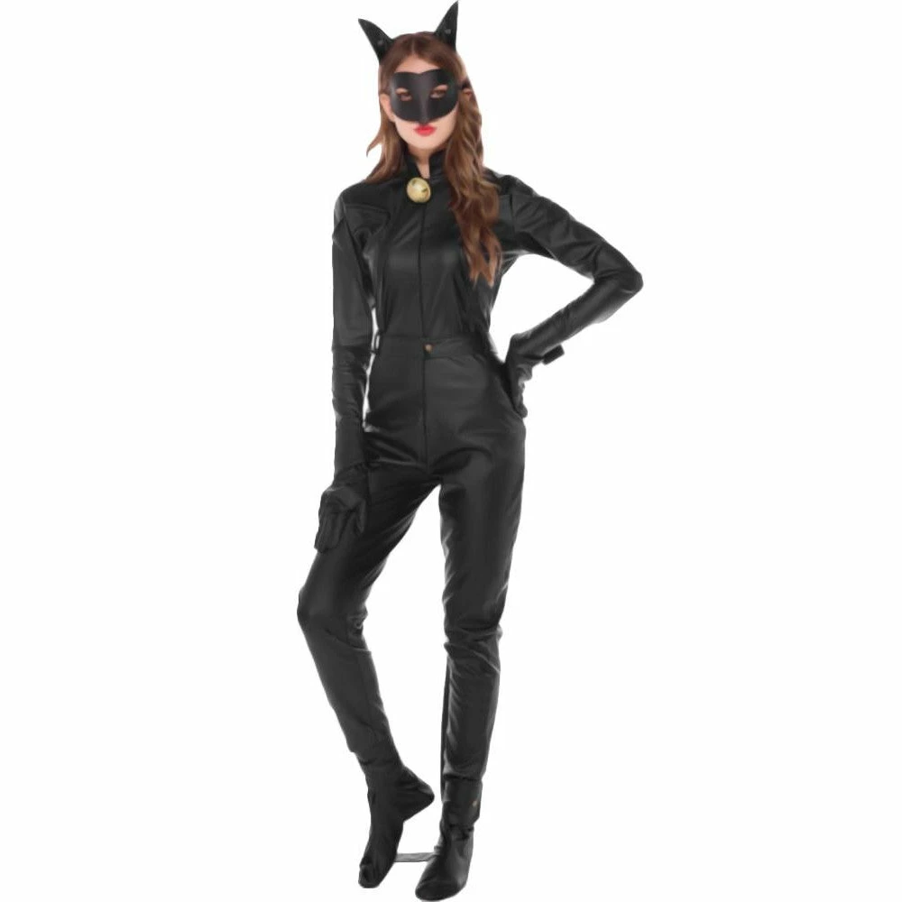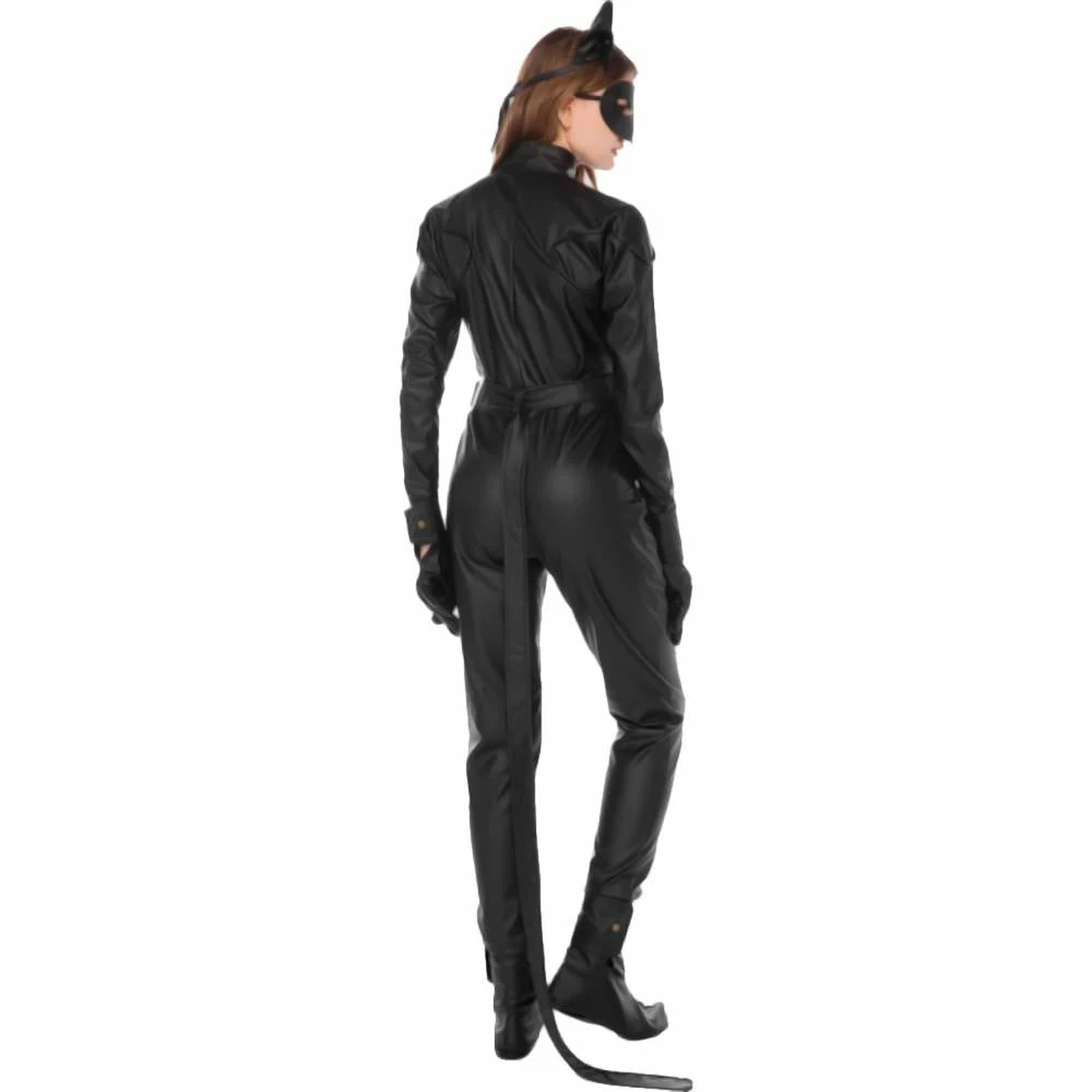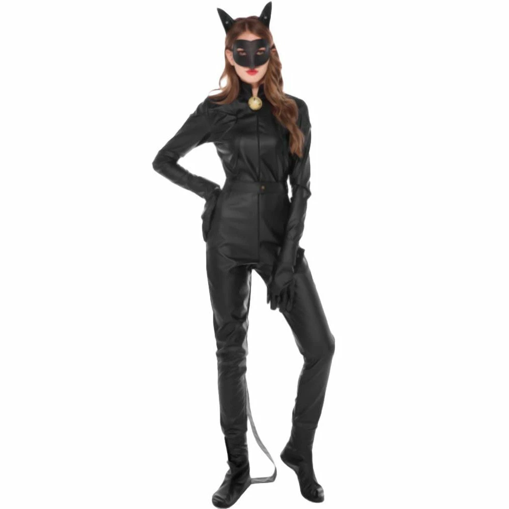 Fun Feline Catwoman Jumpsuit is a stylish outfit that’s guaranteed to make your wildest dreams come true. The suit is top-notch quality faux leather. Unlike other synthetic leather, the material of this product is thick and durable. The jumpsuit covers your lover’s entire body, from her neck to her toes. It has a lovely close collar that makes your partner’s neck appear shorter and her upper torso longer; thus, she will look taller. A golden bell dangles at the suits’ collar for that domesticated appeal. The long sleeves cover her arms up to her wrists. It even has metal rivet buttons so that the cuff will fit tighter to her wrists. It has a long front zipper for easy access during your “sexy time.” Included in the set is a long belt that doubles as a cat’s tail, too! The ensemble comes with a pair of black faux leather gloves and shoes to match the suit. Complete the guise by wearing the fake cat ears and a mask. It has a masquerade-style cover and a cute cat ears headband so your lover’s look will be complete.