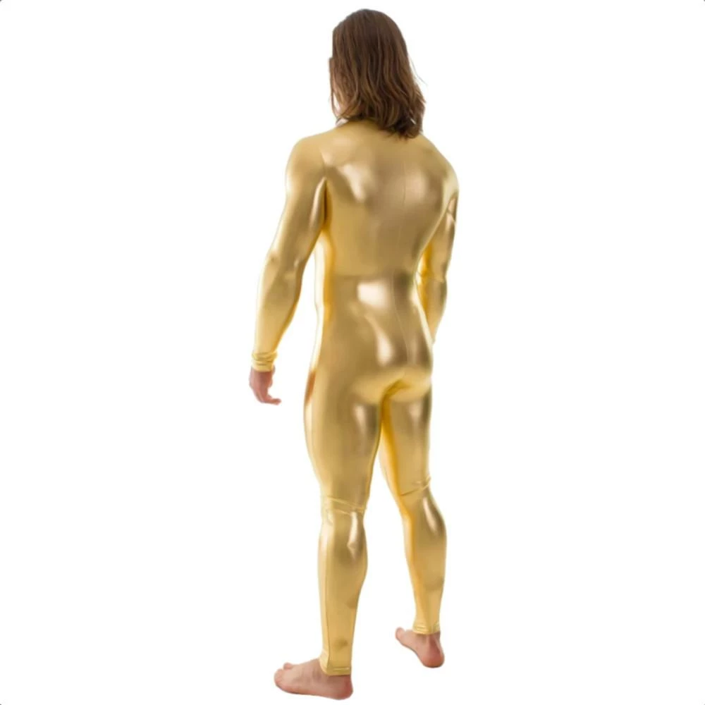 The Men’s Fashionable Gold Catsuit is a fabulous and a bit outrageous ensemble. Create the sexiest persona with this gold treasure. It’s made of high-grade polyester, a firm yet stretchable material that will give your body the right exposure. Polyester is a fashionista’s go-to. It’s shiny, smooth and it is lightweight too.