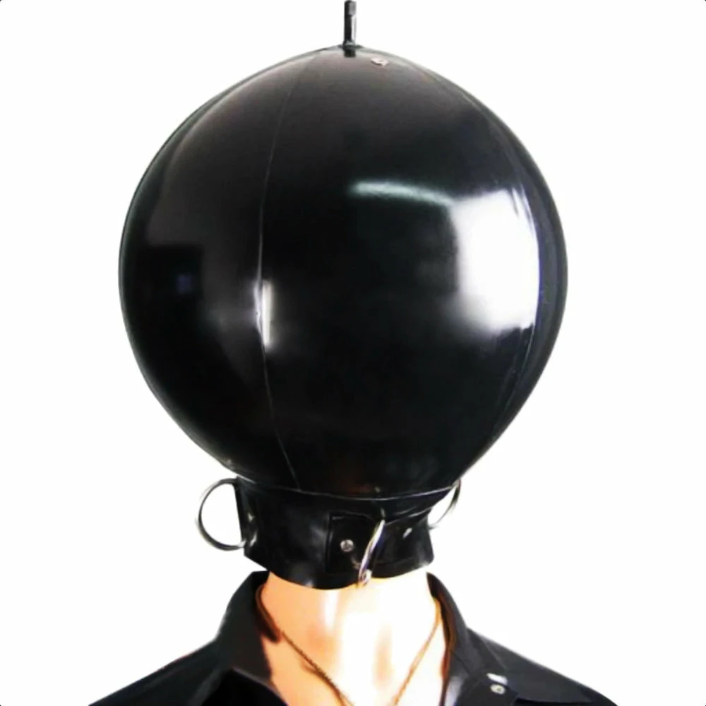 It is a smooth, shiny, and elastic hood made of pure latex to cover your head—from the tip of your hair down to your neck. It is inflatable through the air valve at its top. Pump it up to give the head enough air and space so you can safely breathe inside. And should you need to level up your play and involve chains and ropes, it has a collar with rings on the sides where you can attach your links and strings. It comes in black and red and is available in small to double extra-large sizes. Check the chart below to compare what fits you!