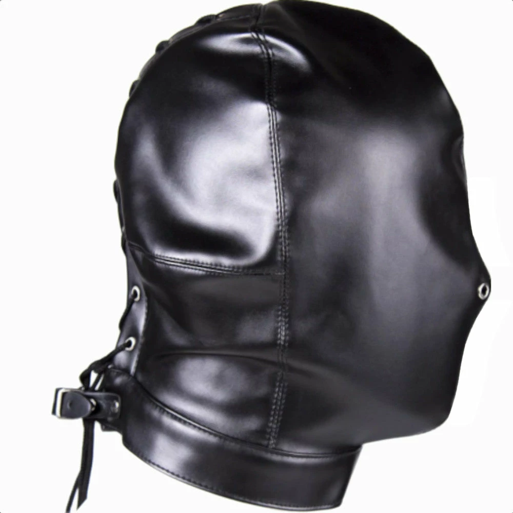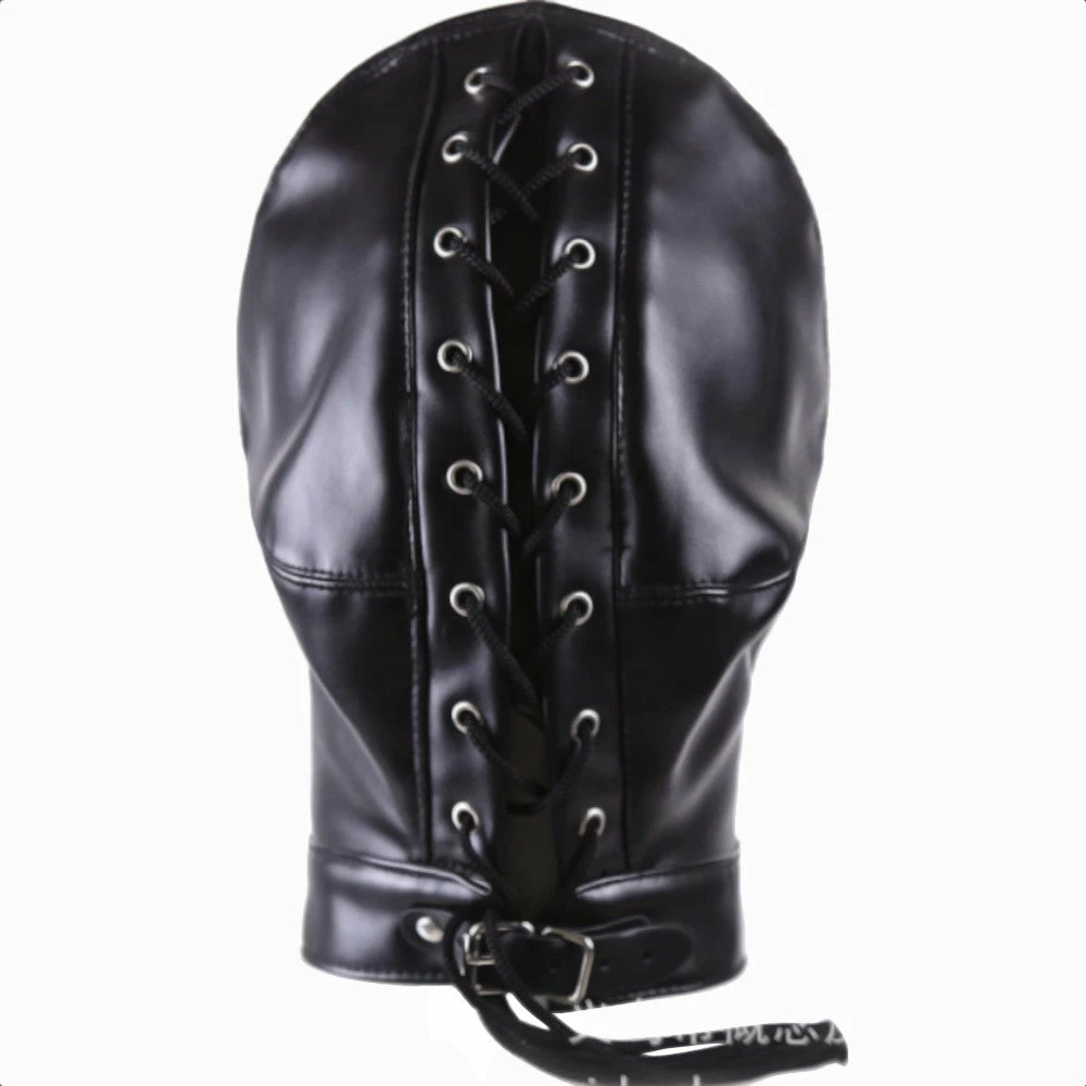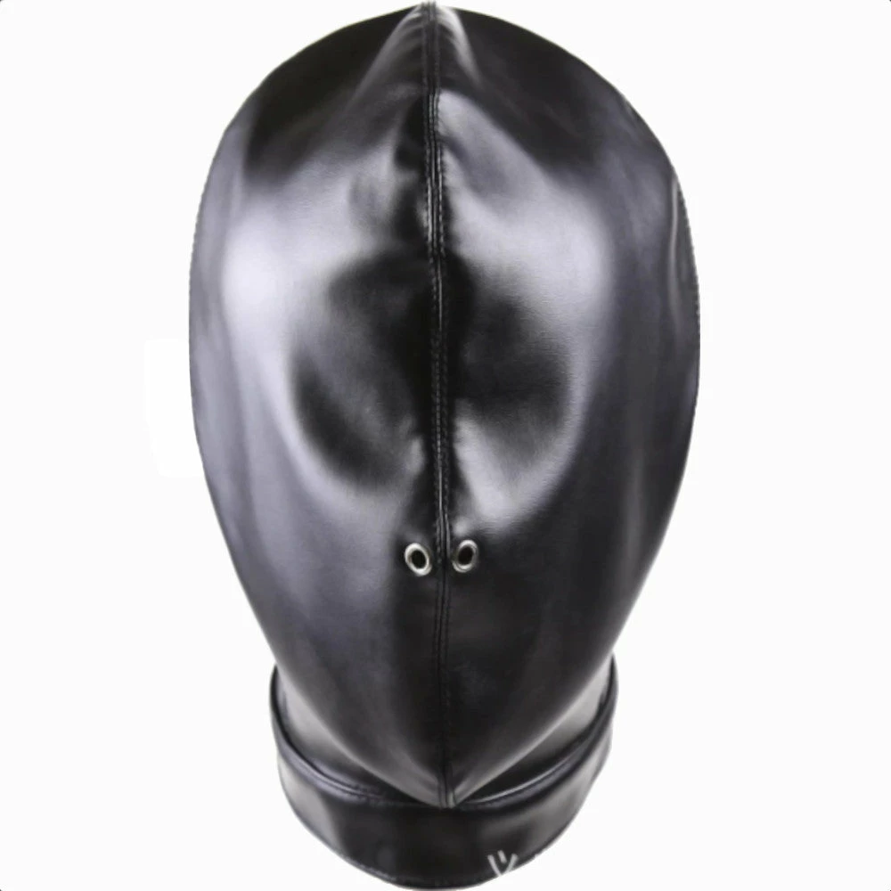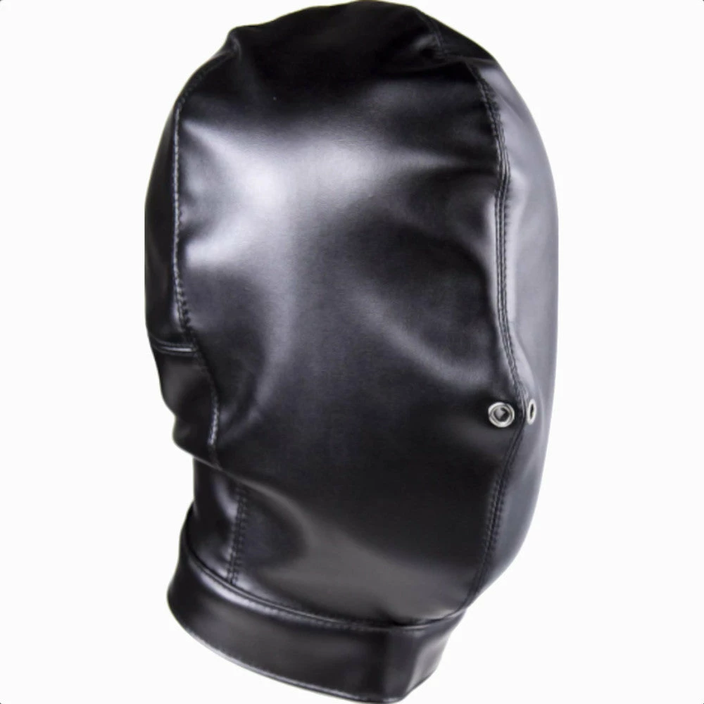The hood has a strap that goes around the neck. The eyes and mouth are fully covered, blocking your partner’s view and preventing him from speaking. That way, all you can hear from him are groans of pleasure.